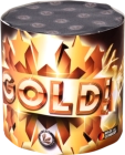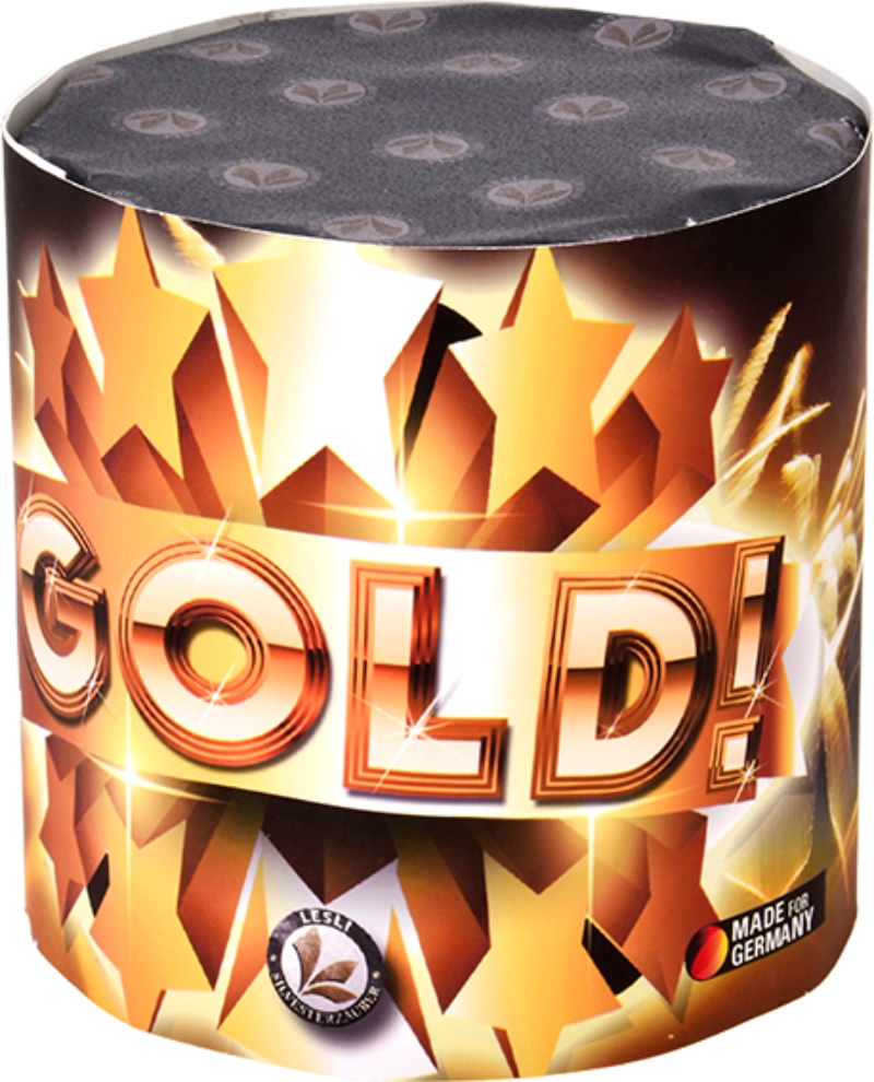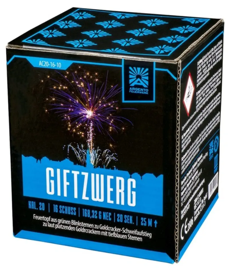 ARGENTO - Giftzwerg16-Schuss BatterieFeuertopf aus grünen Blinksternen zu goldcracker-Schweifaufstieg zu laut platzenden Goldrcrackern mit tiefblauen Sternen.