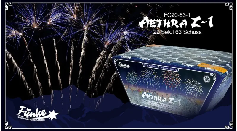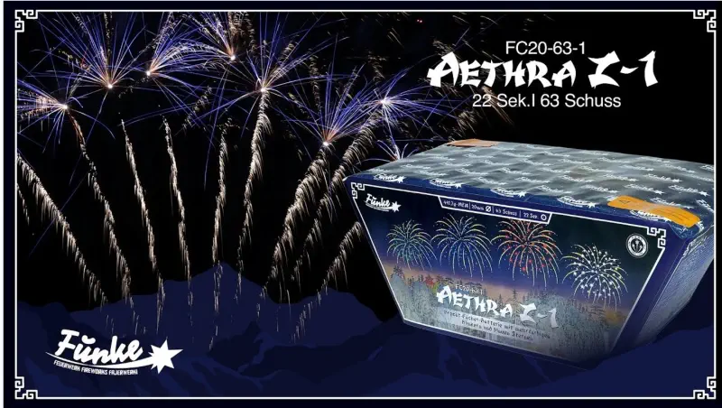 Funke - Aethra Z-163-Schuss BatterieBrokat-Fächer-Batterie mit mehrfarbigen Blinkern und blauen Sternen.1.) Brokatschweif zu Brokatkrone mit weißen Blinksternen2.) Brokatschweif zu Brokatkrone mit grünen Blinksternen3.) Brokatschweif zu Brokatkrone mit roten Blinksternen4.) Finalsalve, Brokatschweif zu Brokatkrone mit blauen Sternen