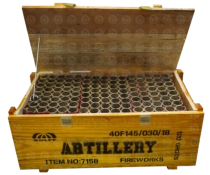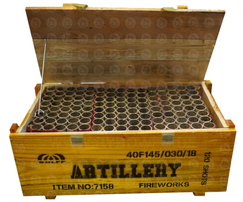 WOLFF - ArtilleryStylisches 120 SchußVerbund-Feuerwerk in Holzkisten-OptikDie originell designte Holzkiste ist schon ein Blickfang für sich... und eignet sich nach dem Zünden sicherlich noch gut, um diverses pyrotechnisches Kleinzeug stilvoll zu lagern. Mächtige Ausbreitung mitkräftigen Zerlegern