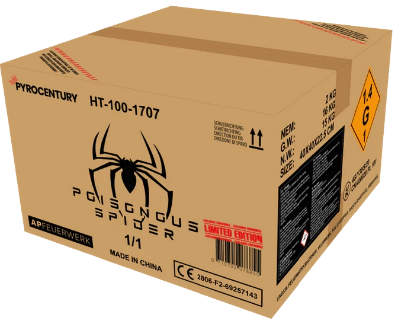 Pyrocentury - Poisonous Spider100 Schuss VerbundSilberner Wirbelaufstieg zu bunten Peonien in Neonfarben