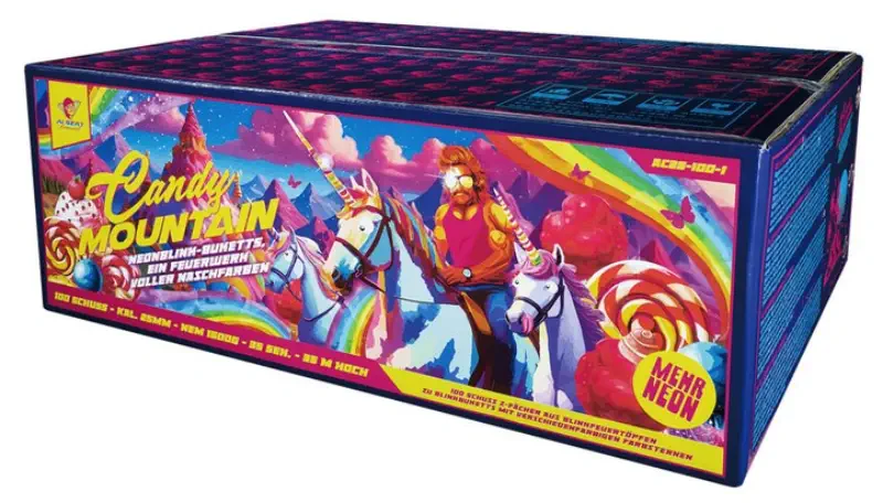 Albert Feuerwerk - Candy Mountain100 Schuss Verbund im Kaliber 25mm, mit ca. 1600g Satzmenge und ca. 35 Sekunden Brenndauer.Z-Fächer aus folgenden Effekten:1.) Goldblinker-Feuertopf zu blauem Leuchtspur-Aufstieg zu Goldblinkern mit purpurnen und blauen Leuchtsternen2.) Grünblinker-Feuertopf zu purpurnem Leuchtspur-Aufstieg zu Grünblinkern mit gelben und purpurnen Leuchtsternen3.) Rotblinker-Feuertopf zu grünem Leuchtspur-Aufstieg zu Rotblinkern mit blauen und grünen Leuchtsternen4.) Feuertopf auf goldenen, roten und grünen Blinkern zu blauem Leuchtspuraufstieg zu blauer und purpurner Päonie mit Blinkern in Rot, Grün und Gold