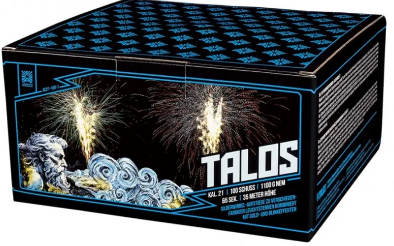 Argento - Talos100 Schuss Verbund im Kaliber 21mm mit Silberwirbel-Aufstiegen zu verschiedenfarbigen Farbsternen kombiniert mit Gold- und Blinkeffekten.