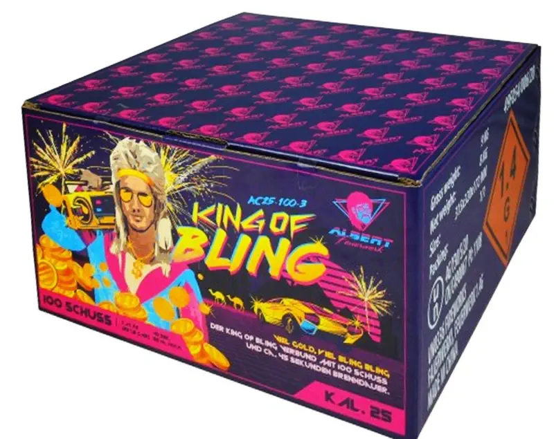 Albert - King of Bling100 Schuss im Kaliber 25mm mit folgenden Effekten: Titangold-Schweifaufstieg zu Titangoldweide mit goldenen Blinksternen, Brokat-Schweifaufstieg zu Brokatkrone mit roten Blinksternen, Titangold-Schweifaufstieg zu Titangoldweide mit grünen Blinksternen, Brokat-Schweifaufstieg zu Brokatkrone mit weißen Blinksternen, Corolla-Schweifaufstieg zu Corollaweide mit Blinksternen in Rot, Grün und Gold.