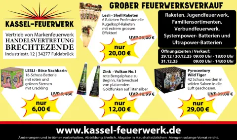 Willkommen bei Bert Brechtezente Feuerwerk in Kassel – Ihrem Fachhändler für hochwertige Feuerwerksartikel, beeindruckende Feuerwerksbatterien, leistungsstarkes Verbundfeuerwerk, bunte Raketen und helles Leuchtfeuerwerk. Ob Silvester, Hochzeit oder Jubiläum (nur mit Ausnahmegenehmigung). Wir bieten Ihnen geprüfte Qualität, starke Effekte und fachkundige Beratung. Besuchen Sie unseren Feuerwerksverkauf in Kassel und entdecken Sie ein breites Sortiment für Profis und Feuerwerksliebhaber. Mit langjähriger Erfahrung sorgen wir dafür, dass Ihr Feuerwerk sicher, eindrucksvoll und unvergesslich wird.